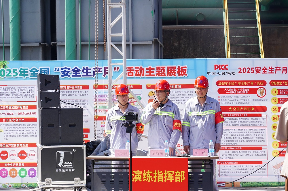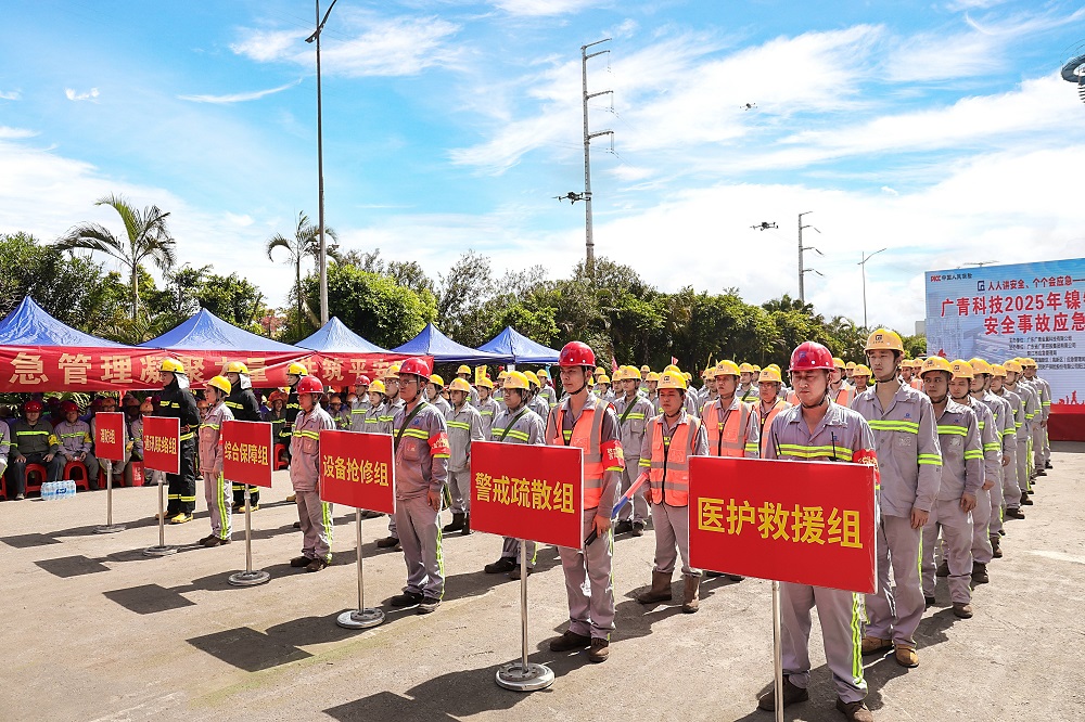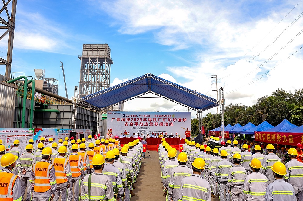 为深入学习贯彻习近平总书记关于安全生产重要论述,全面落实“人人讲安全、个个会应急——查找身边安全隐患”的安全生产月主题,6月24日,广东广青金属科技有限公司在镍铁厂举行2025年矿热炉漏炉安全事故应急救援演练。公司董事、总经理何丛珍等领导班子成员以及260多名员工代表参加演练;广新集团安全总监兼安环部总经理王磊,阳江市应急管理局基础科科长杜锋杰,阳江滨海新区应急管理局局长梁一聪,阳江高新区消防大队、中国人保阳江分公司等相关单位领导到场观摩指导。