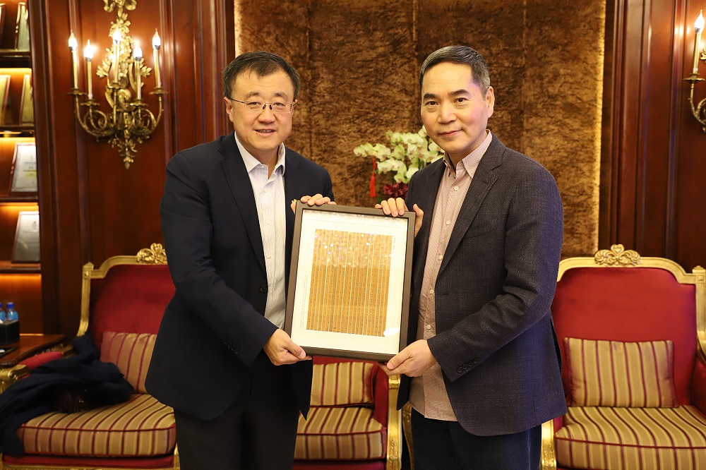 座谈会后,项光达主席邀请杨斌副校长共进晚餐,双方交换礼物并合影留念。
